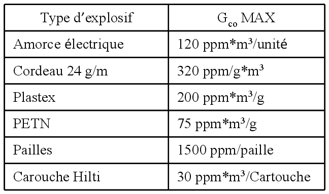 Dans le tableau ci-dessous, la production de CO de différentes substances explosives. Ceci permet d’évaler rapidement la concentration de CO conséqutive au tir. C’est très efficace pour évaluer la faisabilité d’un minage en milieu confiné, en comparant cette concentration aux normes d’exposition. Elle ne dispense évidemment pas de la mesure en continu de la concentration de CO.