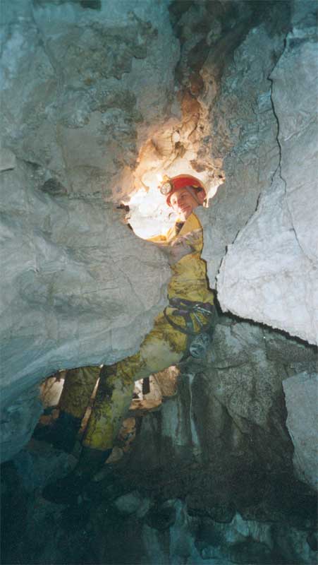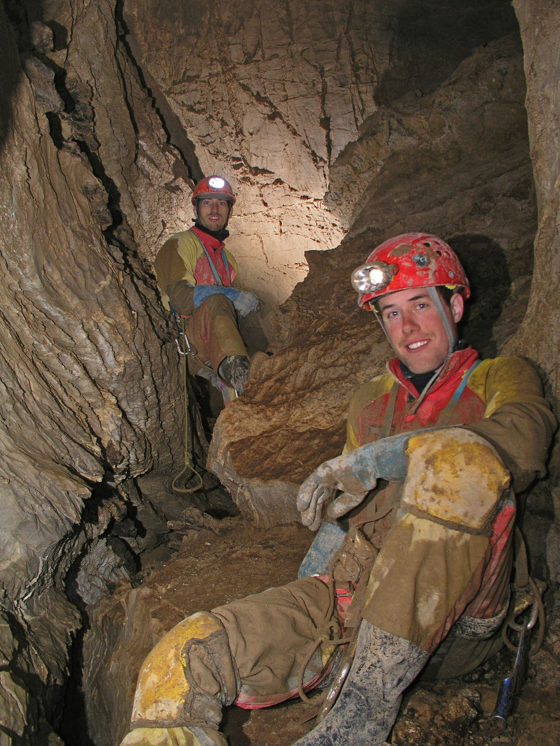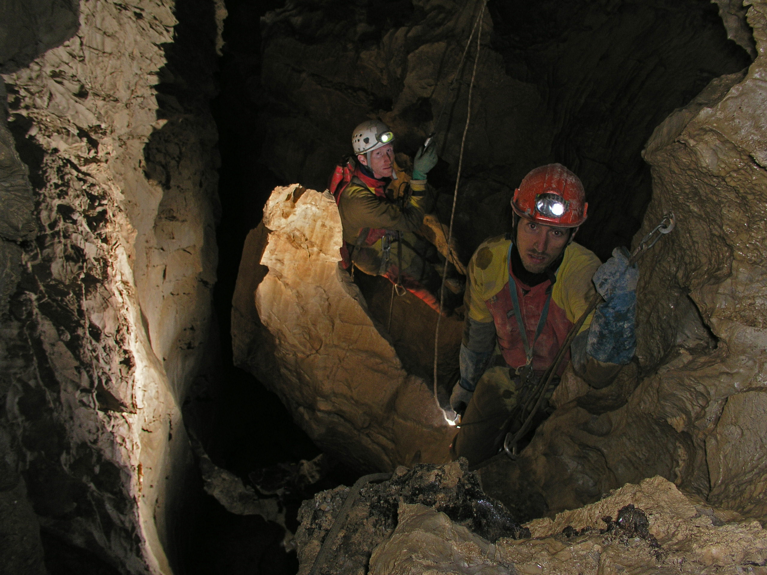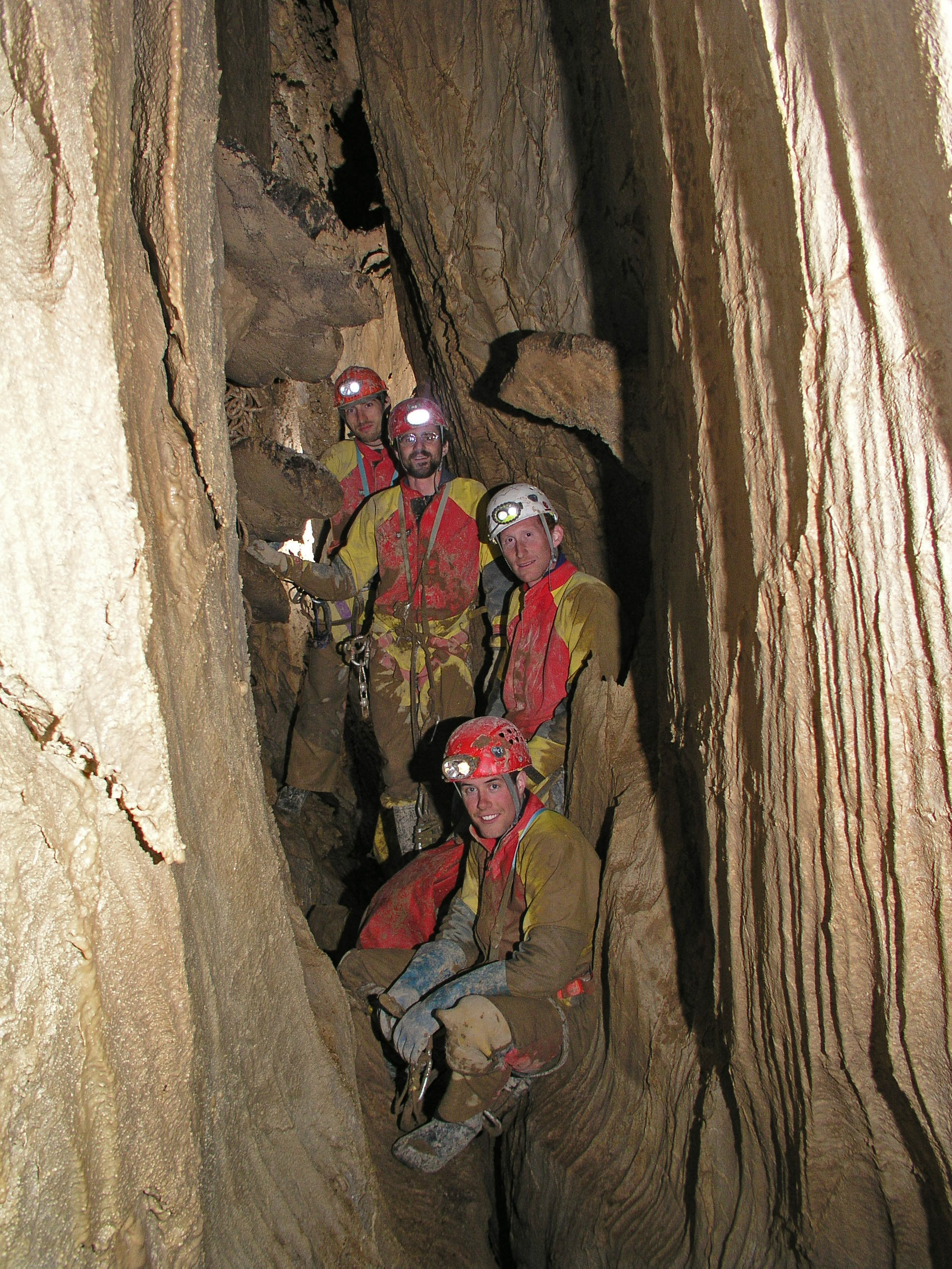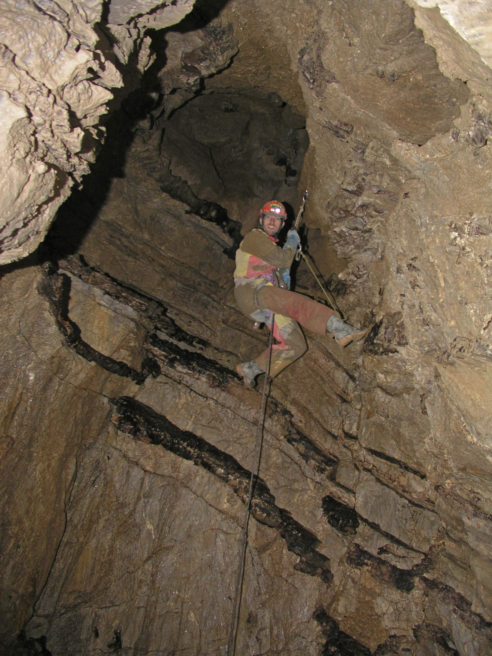 Ce n’est que six ans plus tard que de nouvelles expés sont organisées pour désobstruer et forcer quelques étroitures. En avril 2007, une suite conséquente est découverte, avec notamment un premier beau puits zébré de silex. L’exploration continue par un beau méandre mesurant une douzaine de mètres de hauteur descendant en suivant le pendage, assez exceptionnel pour la région. La cavità atteint déjà -70 mètres, avec arrêt sur un haut méandre très étroit et surtout très technique.