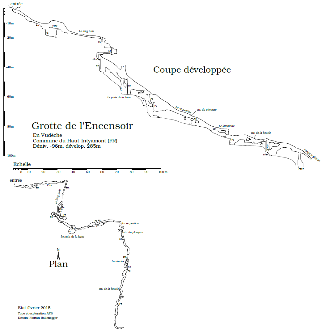 En 2013 et lors du camp Foliiu Borna 2014, une équipe surmotivée de Folliu-Bornés force le méandre terminal et progresse sur une bonne distance en descendant plusieurs puits et en cassant les silex obstruant le passage. L’exploration se termine en été 2014 au sommet d’un puits, vers une profondeur de -100 mètres. En mai 2015, la cavité atteint -130 mètres avec arrêt sur une étroiture à agrandir. L’Encensoir, une cavité très difficile, fait déjà partie des grands. A suivre !