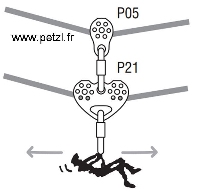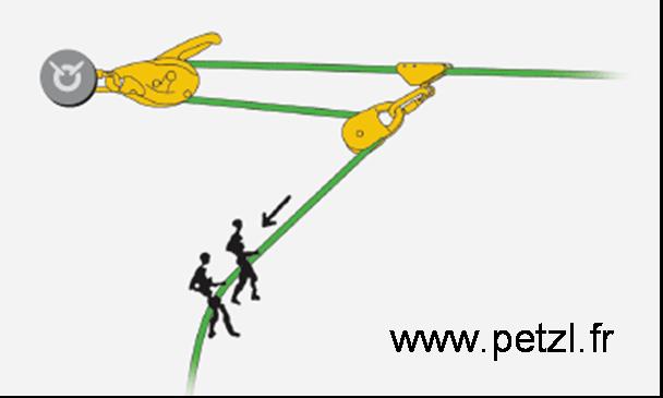 • 1 palan simple pour la traction. 1 poulie-bloqueur (Petzl Pro Traxion) + 1 poulie + 1 bloqueur.