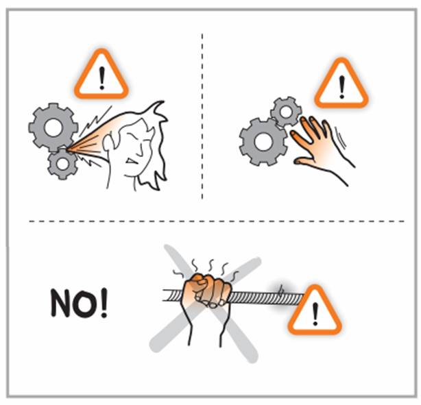 Attention aussi aux cheveux et aux doigts qui pourraient se prendre dans la poulie ! Ne pas saisir la corde, au risque de s’y brûler (toujours porter des gants) !