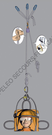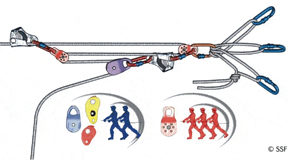- aucune poulie ou dispositifs à roulement => trois sauveteurs simultanément à la traction.