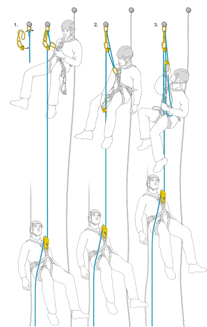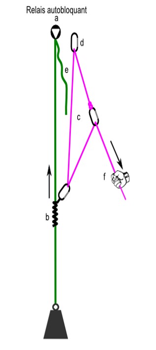 Ce système permet un passage rapide de la montée à la descente. Il nécessite cependant une corde 4X plus longue que la distance à parcourir. La démultiplication théorique est de 1:4.