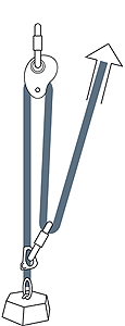 Un des mouflage le plus simple.C’est aussi la topologie de base pour plusieurs des palans ci-dessous. Elle a une démultiplication d’un facteur 3 (Q3), car 3 cordes sont sur la poulie mobile(ici un mousqueton).