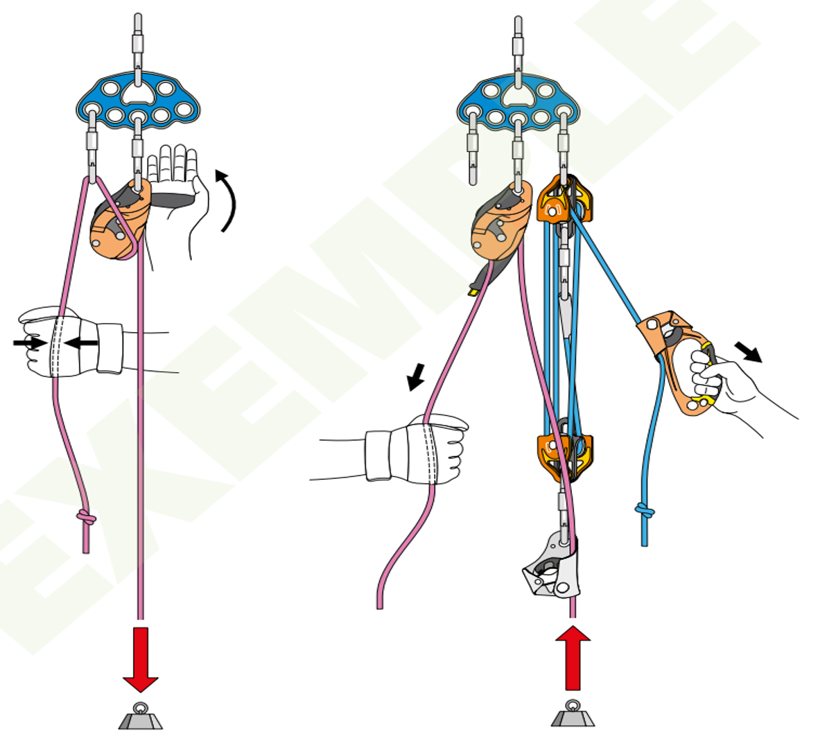 - une poulie à roulement (MICRO TRACTION, PRO TRACTION, …) => deux sauveteurs simultanément à la traction.