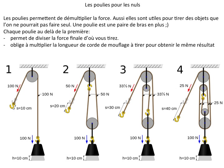 Les mouflages permettent de démultiplier la traction afin de lever des charges. Ils sont le plus souvent basés sur des poulies, des poulies mobiles et des bloqueurs. La démultiplication dépend de la topologie, comme le montre l’illustration ci-dessous.