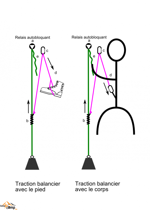 Le balancier est une technique très efficace consistant à profiter de son propre poids pour lever la charge. Ceci est utilisé en secours et en auto-secours pour un dégagement vers le haut.