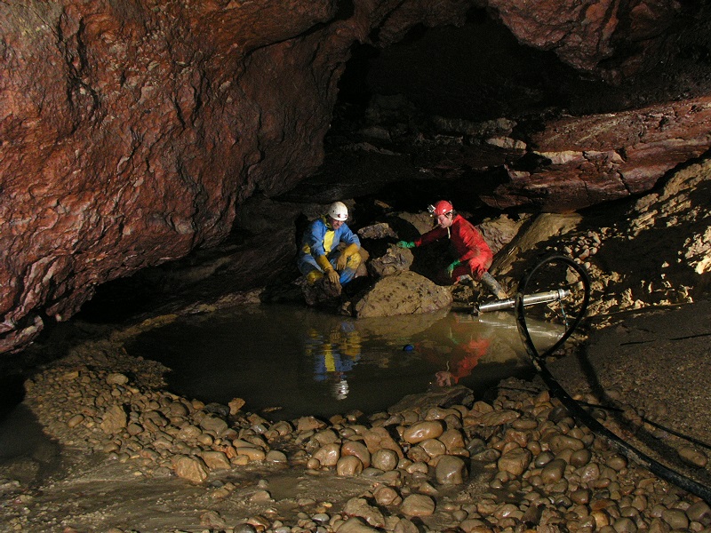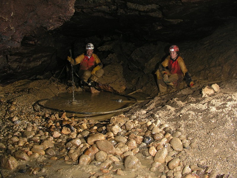 Un projet un peu fou de pompage a permis de passer trois siphons successifs, avec de l’eau à remonter sur une dénivellation de 30 mètres jusqu’à l’entrée. Le pompage nous a permis d’atteidre une altitude sous le niveau de la source pérenne qui continuait à couler normalement. Incroyable !