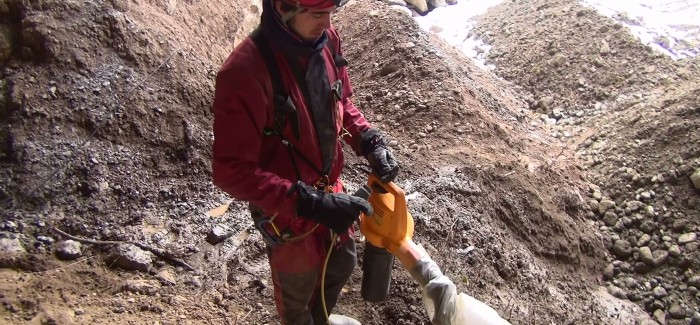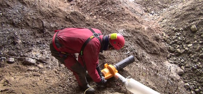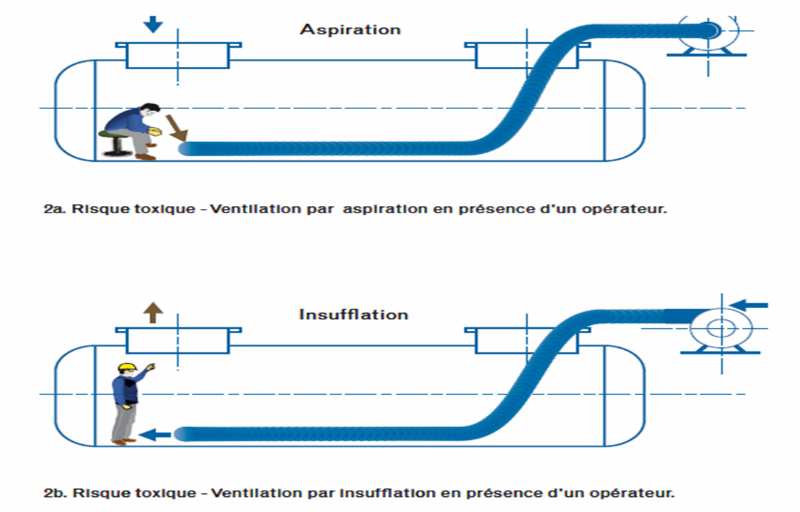 La technique que nous utilisons est basée sur des gaines en plastiques flexibles et un ventilateur électrique. En soufflage, il faut être particulièrement prudent avec le déplacement des gaz toxiques et les intoxications à distance sur le trajet du courant d’air. Sur la vidéo ci-dessous, la stratification des gaz et poussières est clairement visible.