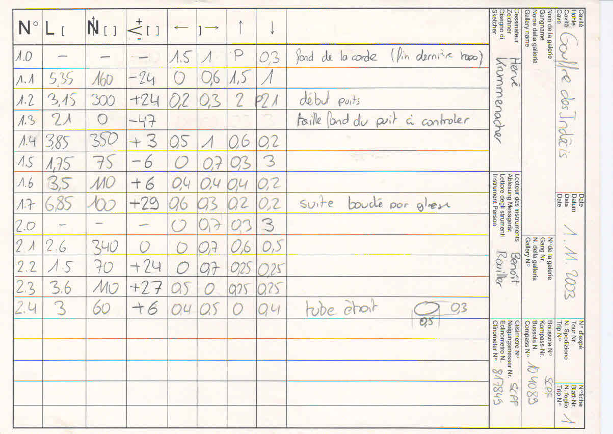 Les visées sont complétées par un croquis de terrain, comprenant le dessin en plan et en coupe, avec la position de toutes les stations. Il est préférable de le dessiner à l’échelle sur du papier millimétré. Afin de pouvoir travailler en milieu humide, les notes sont prises avec un crayon gras sur du des feuilles en syntosil. Certains utilise aujourd’hui un « carnet top électronique » et un logiciel ad’hoc (voir ci-dessous).