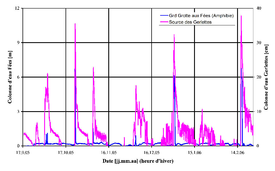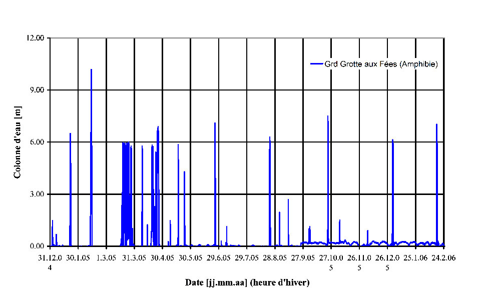 Rivière souterraine avec un débit de 2 m3/s (étiage) à 80 m3/s (crues). L’eau provenant en partie de pertes dans le lac Brenet explique les fortes varations de température de l’eau, de 4 à 13 °C. Cette cavité pourrait avoir de l’intérêt pour de l’hydro-électricité, mais comme c’est un géotope d’importance national, c’est très improbable.