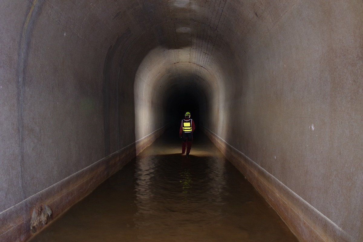 Nos photographies de cette impressionnante galerie d’amenée, encore partiellement accessible, en mars 2017, :