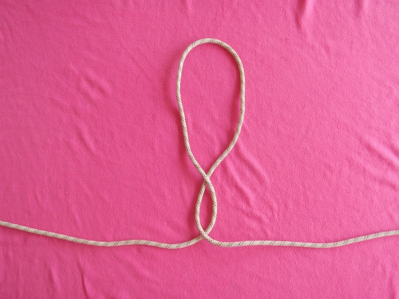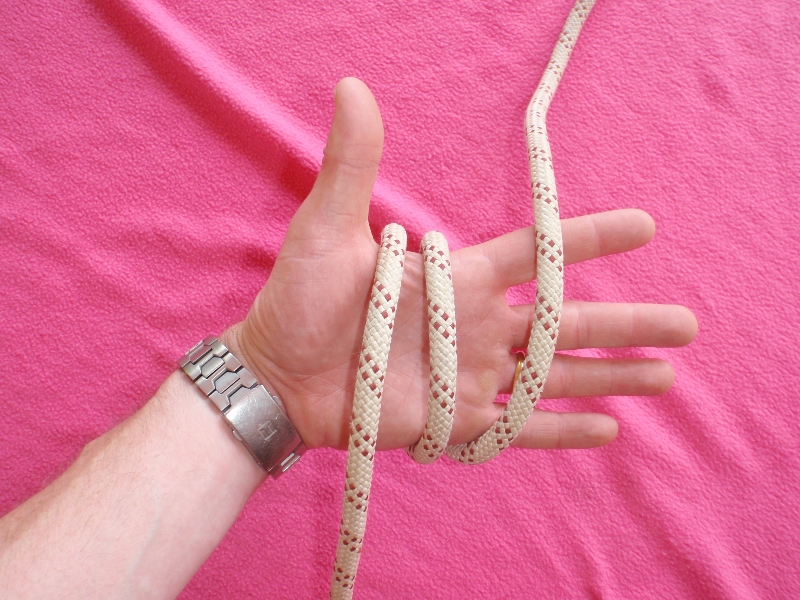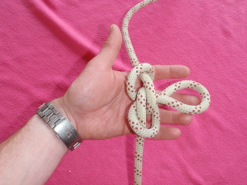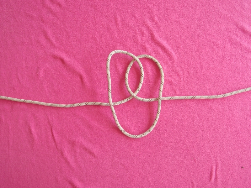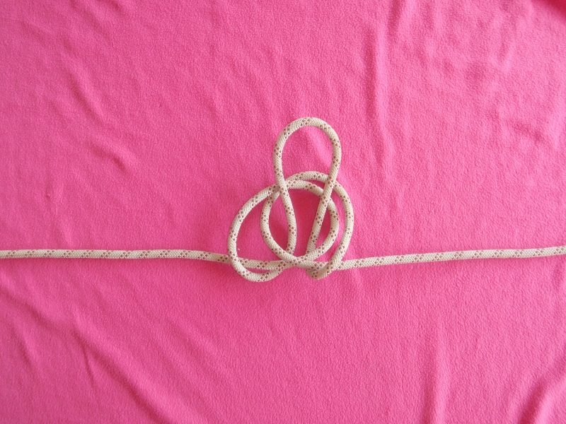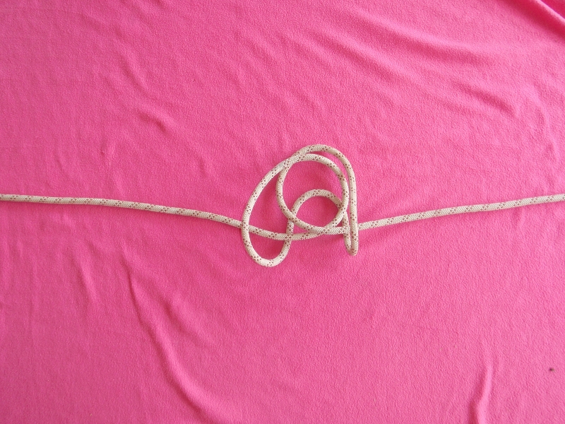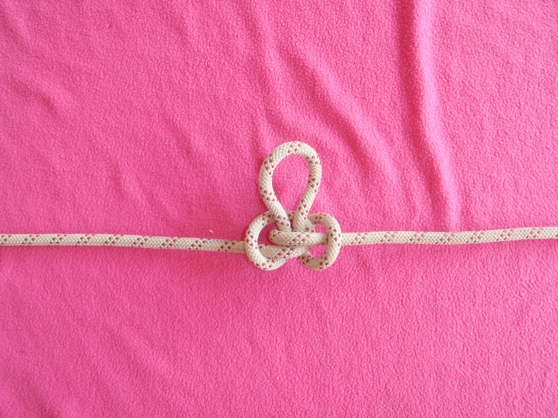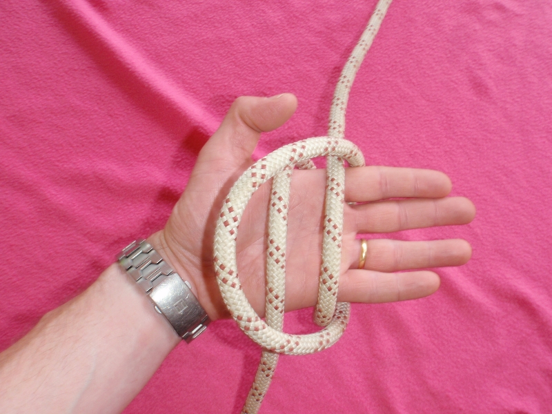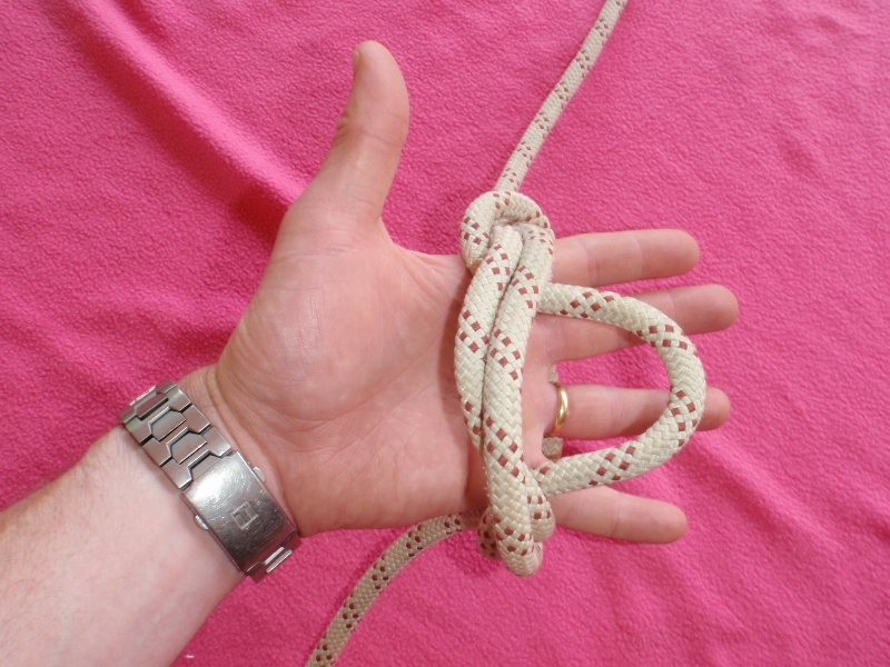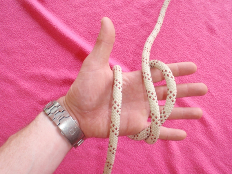 Ce noeud se réalise plus facilement autour de la main. Après avoir entouré trois fois la main, prendre le brin du milieu et le faire passer par dessous une boucle, puis par dessous toutes les boucles. Facile !