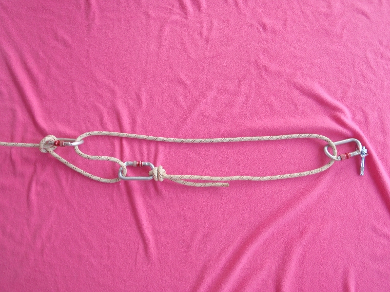 Réaliser le nœud pour comprendre facilement son fonctionnement. Oui, le mousqueton est bloqué et c’est sur les cordes multiples, dans des directions opposées, que le nœud fonctionne. 🙂